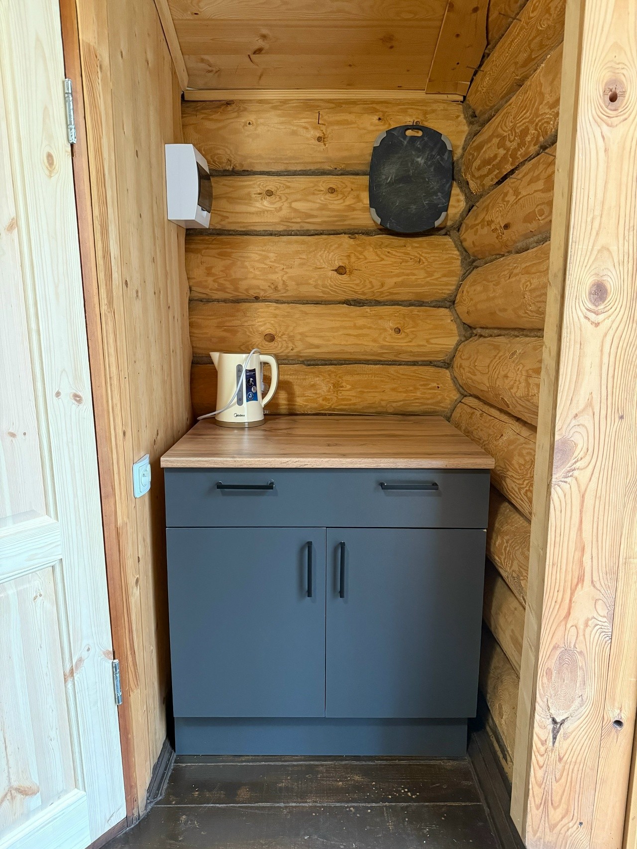 кухонный уголок с холодильником, чайником, электрической плитой, мультиваркой и посудой на 6 человек