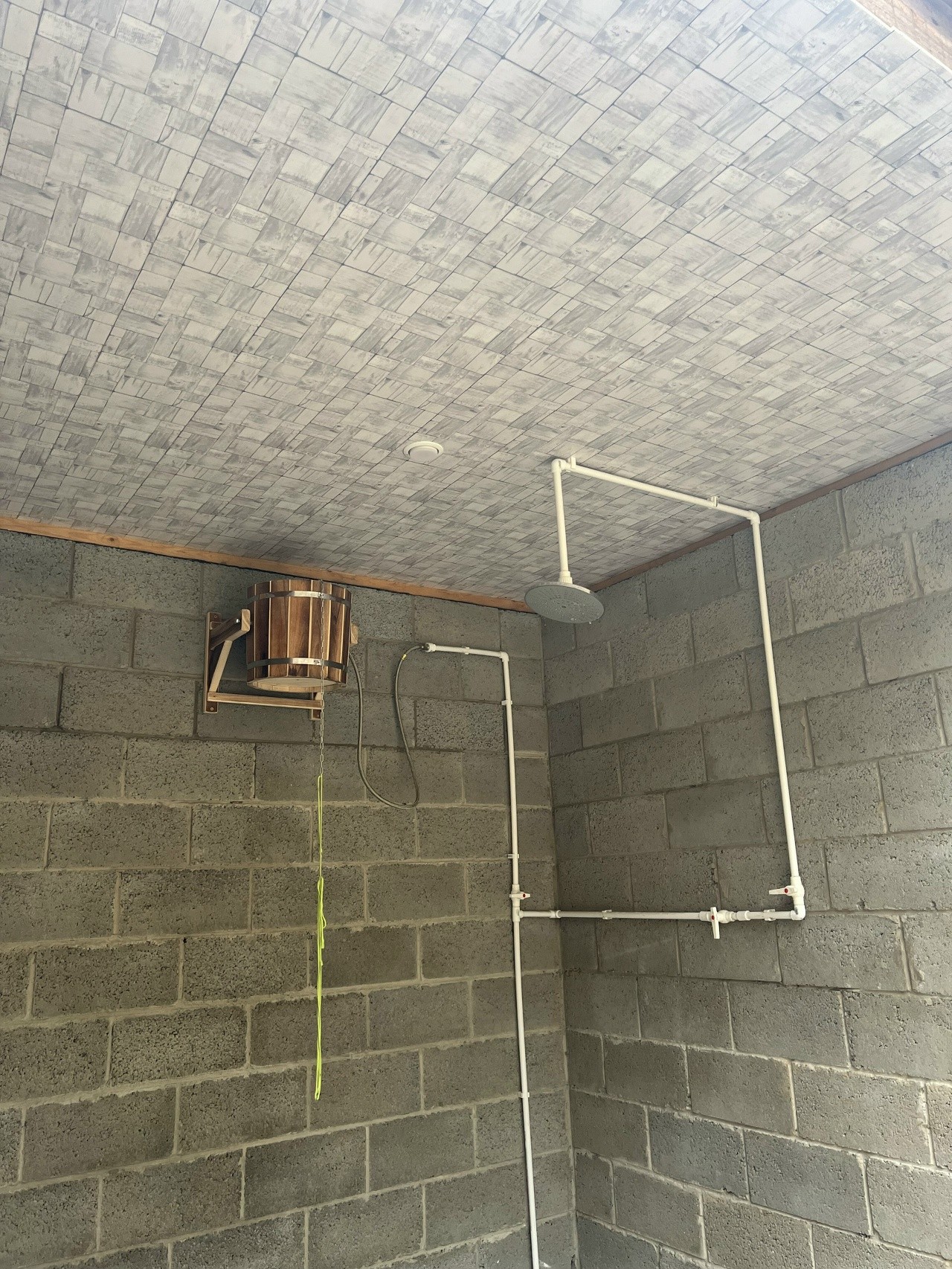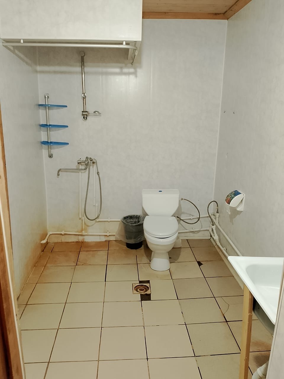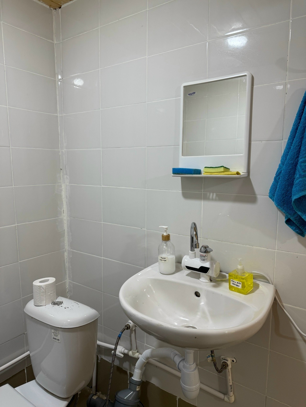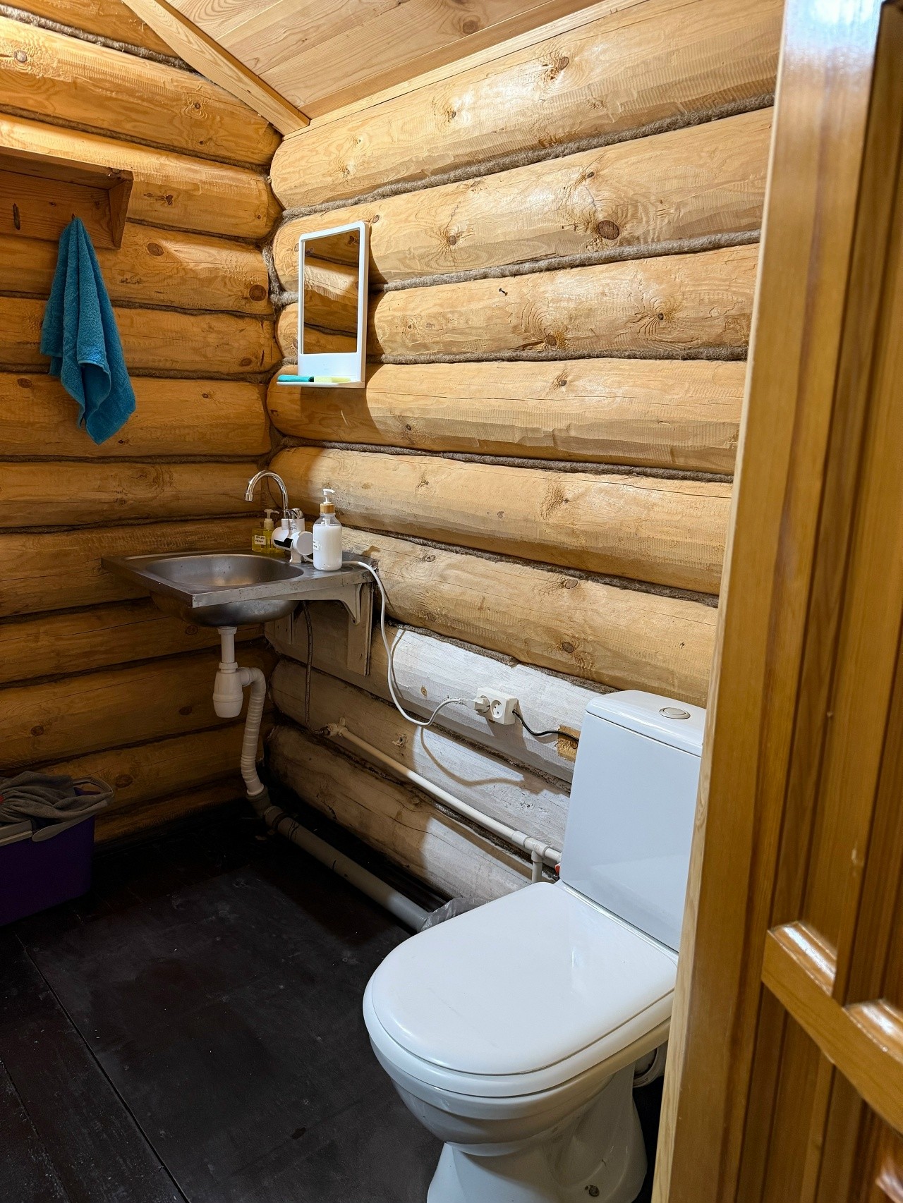 личный туалет с унитазом, раковиной с горячей водой, мылом и средством для мытья посуды