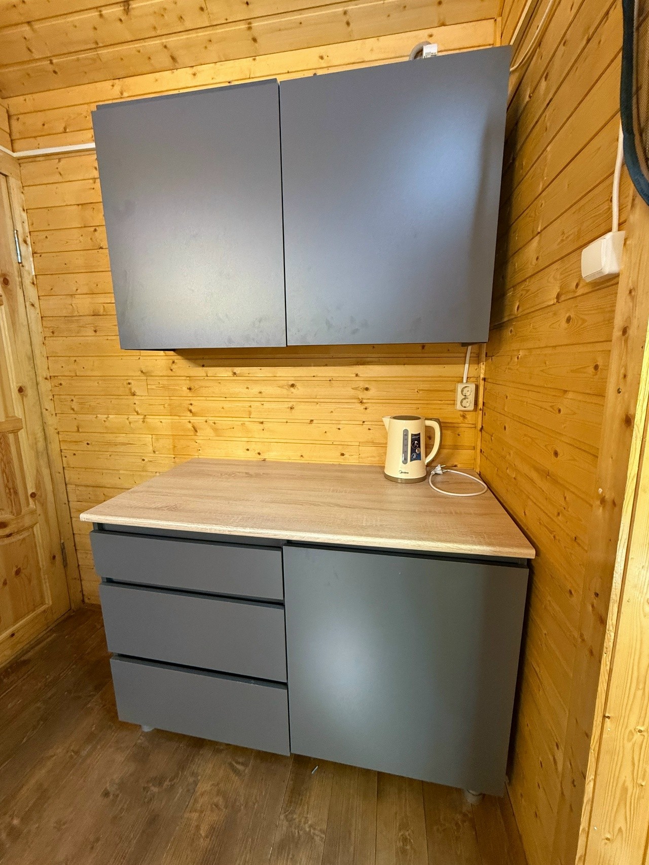 кухонный уголок с холодильником, чайником, электрической плитой, мультиваркой и посудой на 5 человек