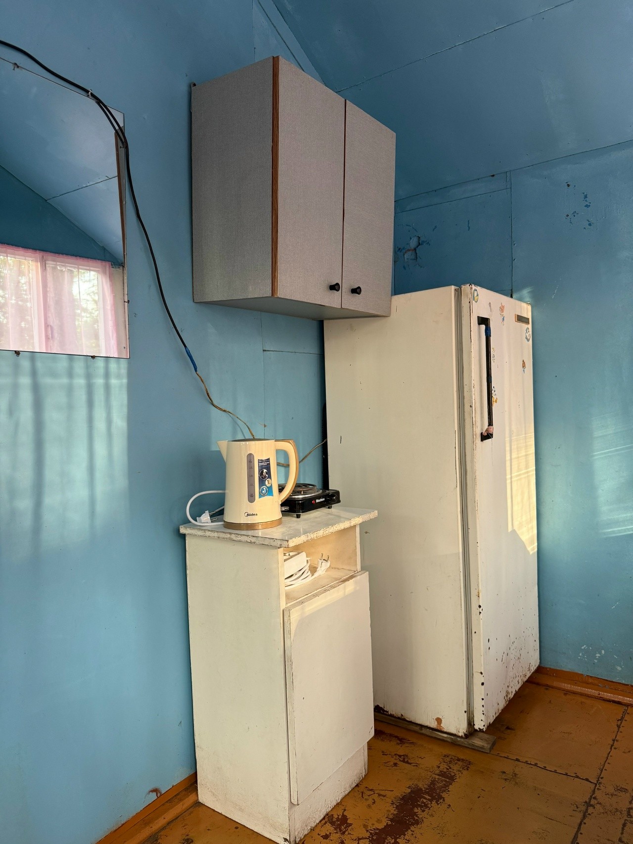 кухня с холодильником, чайником, электрической плитой и посудой на 3 человек