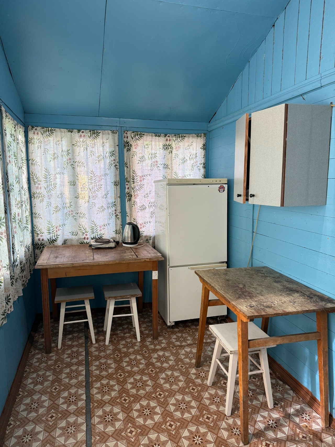 кухня с холодильником, чайником, электрической плитой и посудой на 13 человек